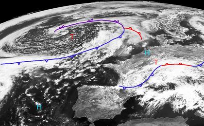 Zwei Tiefdruckgebiete bringen in vielen Teilen Europas heute Mittag dichte Wolken. Zwischen dem Tief 'Monika' südlich von Island und dem Tief 'Ludmilla' über Südfrankreich konnte sich ein Keil eines Azorenhochs über das nördliche Frankreich bis nach Nordpolen ausbreiten. Das neue Hoch 'Qualid' über Nordfrankreich, das dabei enstand, hält 'Monika' morgen noch von Mitteleuropa fern. Am Donnerstag jedoch greifen die Ausläufer des Tiefs dann auf Mitteleuropa und auch Deutschland aus, womit die kurze Wetterbesserung voraussichtlich schon wieder zuende geht. (Bildquelle: Copyrigt EUMETSAT, NERC Satellite Receiving Station, University of Dundee)