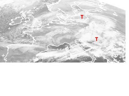Die Tiefdruckgebiete 'Melli' über Polen und 'Nanni' über Kroatien sorgen mit ihren Ausläufern für dichte Wolken und unbeständiges Wetter mit Regen, Schnee und teils kräftigen Wind in weiten Teilen Europas. Nur im Süden von Spanien bleibt es überwiegend trocken. (Bildquelle: NERC Satellite Receiving Station, Dundee University, Scotland, http://www.sat.dundee.ac.uk/)