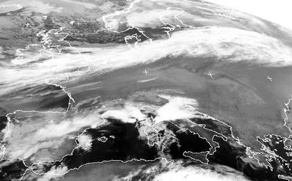 Das breite Wolkenband, dass sich von England über Norddeutschland bis ins Baltikum erstreckt ist der Ausläufer eines Tiefs über Südschweden. Er zieht heute im Laufe des Tages weiter nach Süden und sorgt für regnerisches Wetter. Über Südfrankreich und Italien sind ebenfalls Hochreichende Wolken, sie sorgen heute für Schauer und Gewitter. Von der Biskaya bis nach Russland und Südosteuropa ist der Himmel unter Hochdruckeinfluss teils freundlich, teils jedoch auch trüb.