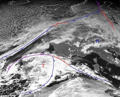 Die Wolken der Ausläufer des Tiefs 'Sabrina' über dem Nordmeer liegen heute von Skandinavien bis nach Polen und weiter westlich bis zu den Britischen Inseln und auf dem Atlantik hinaus. Auch über der Iberischen Halbinsel befindet sich ein Tief mit vielen Wolken. Zwischen diesen beiden Tiefdruckgebieten hat sich über den Alpen das Hoch 'Paolini' etabliert, das heute zumindest von Südfrankreich und Südwestdeutschland bis nach Italien für wolkenärmeres und trockenes Wetter sorgt. Morgen ziehen die Ausläufer von Tief 'Sabrina' weiter nach Südosten und errreichen dann Mitteleuropa. Damit fließt auch wieder kühlere Luft nach Deutschland ein. (Bildquelle: Copyrigt EUMETSAT, NERC Satellite Receiving Station, University of Dundee)
