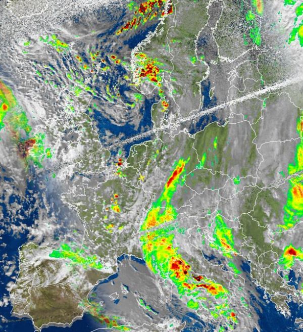 Das Satellitenfoto von Dienstag Nachmittag zeigt kompakte und hochreichende Bewölkung im Bereich der italienischen Mittelmeerküste, diese Wolken gehören zu einem Frontensystem eines Tiefs über Italien. Dabei kam und kommt es in den Regionen zu vielfach ergiebigen und langanhaltenden Regenfällen. Zudem traten örtliche, meist kurze Gewitter auf. In den kommenden Tagen bleibt Italien zum Großteil unter Tiefdruckeinfluss mit wechselhaften und oft nasskaltem Schauerwetter.