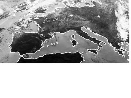 Weite Teile Europas liegen unter Hochdruckeinfluss. Deshalb sind auf dem Satellitenbild von heute mittag nur wenige Wolken zu erkennen. Dabei heben sich die kühleren Wassermassen vom Mittelmeer und von Nord- und Ostsee (im Infrarot-Bereich heller dargestellt) deutlich von den wärmeren Landmassen (im Infrarot-Bereich dunkler dargestellt) ab. (Bildquelle: NERC Satellite Receiving Station, Dundee University, Scotland, http://www.sat.dundee.ac.uk/)