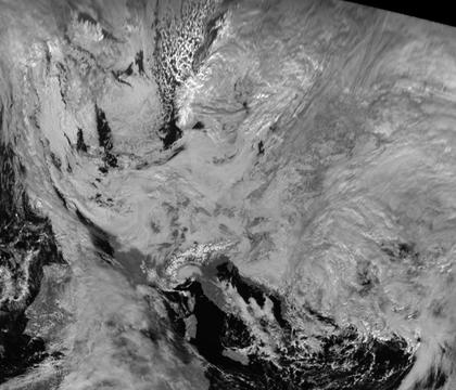 Europa zeigt sich auf dem Satellitenfoto zum großen Teil unter dichten Wolken. Über dem Süden Skandinaviens befindet sich das Tief 'Petra' auf dessen Rückseite labilisierte Kaltluft einfließt, was deutlich an der zellulären Bewölkung erkennbar ist. Die Alpen zeigen sich wolkenarm und dicht verschneit. Auch große Seen wie der Gardasee sind erkennbar.