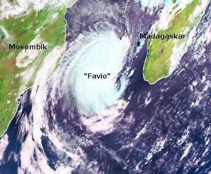 Der Zyklon 'Favio' befindet sich derzeit vor der Küste Mosambiks. Seine Spitzenwindgeschwindigkeiten betragen zur Zeit 300 km/h in Böen. Am 23.2. soll er dann das Festland erreichen und dabei noch mittlere Windgeschwindigkeiten von 200 km/h, in Böen bis 250 km/h aufweisen.