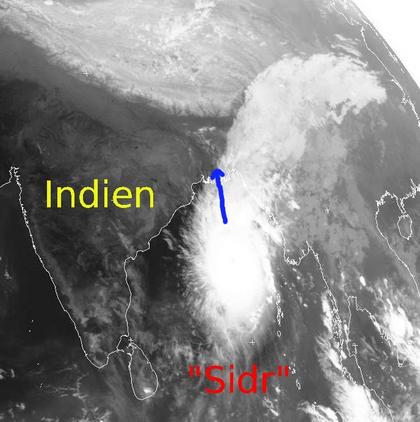 Der Zyklon 'Sidr' über dem Golf von Bengalen erreicht heute Mittag Windgeschwindigkeiten von 225 km/h im Mittel und 270 km/h in Spitzenböen. Nach Einordnung in die Saffir-Simpson-Skala hat er damit die zweithöchste Kategorie 4 erreicht. Bis morgen verlagert sich 'Sidr' weiter nordwärts und trifft dann mit großer zerstörerischer Kraft vermutlich an Land. Insbesondere Bangladesh und Indiens größte Stadt im Nordosten, Kalkutta, sind von großen Schäden und massiven Überschwemmungen bedroht. (Bildquelle: NERC Satellite Receiving Station, Dundee University, Scotland, http://www.sat.dundee.ac.uk/)