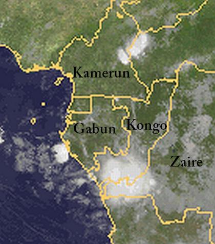 Eine mächtige Gewitterzelle hat sich heute Mittag über dem südlichen Kongo und dem westlichen Zaire gebildet. Kräftige Regenfälle sind die Folge. Aber auch über dem nordöstlichen Kamerun und dem westlichen Zentralafrika befindet sich eine Gewitterzelle, ebenso an der Küste von Gabun. Während der Regenzeit, die in dieser Region etwa von Oktober bis Mai dauert, entstehen im Tagesverlauf immer wieder teils kräftige Gewitter.