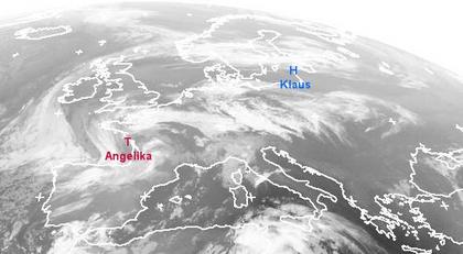 Auf dem heutigen Satellitenfoto zeigt sich Tief 'Angelika' über Westfrankreich. Sie sorgt vor allem entlang der Atlantikküste von Frankreich, Spanien und dem Norden Portugals für zahlreiche, teils kräftige, Schauer.