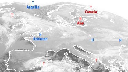 Auf dem heutigen Satelittenfoto zeigt sich eine breite Hochdruckbrücke von der französischen Atlantikküste, über Frankreich, die Alpen nach Osten bis nach Südwestrussland herein. Ebenfalls Unter Hochdruckeinfluss liegt die Nordwesthälfe der Iberischen Halbinsel. Weniger sonnig und freundlich ist es dagegen von den Britischen Inseln, über Skandinavien und die Nordhälfte Deutschlands bis nach Westrussland, hier sorgen vielfach dichte Wolken für häufige Schneefälle, teils bleibt es auch trocken, aber es bleibt meist winterlich kalt. Im Mittelmeerraum sorgen zwei Tiefdruckgebiete für zahlreiche Schauer besonders im westlichen sowie östlichen Mittelmeer.