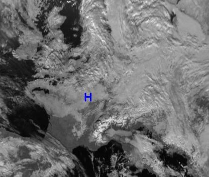 Das Hoch 'Christian' liegt mit seinem Zentrum über Frankreich und sorgt für trockenes und teils freundliches Wetter im Süden. Auf dem Satellitenbild von Montag Mittag ist dabei der Verlauf der Alpen gut zu erkennen. Weiter östlich sorgen Tiefausläufer für meist dichte Wolken mit etwas Regen oder Schnee.