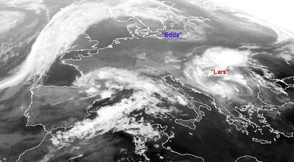 Auf dem Satellitenbild von Donnerstag früh erstreckt sich die Kaltfront eines Tiefs westlich bei Island von Irland bis nach Norwegen und bringt dort heute Regen oder Schauer. Über dem Balkan sorgt das Tief 'Lars' noch für zum Teil kräftige Schauer und Gewitter. Auch in den Pyrenäen sind kräftige Gewitter möglich, sonst sind unter Einfluss von Hoch 'Edda' nur wenige Wolken über Europa zu erkennen.
