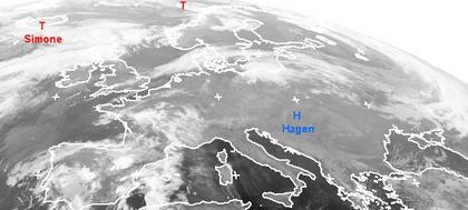 Hoch 'Hagen' liegt mit seinem Schwerpunkt heute über Ungarn und sorgt mit seinem Einfluss von Südengland, über Frankreich, den Beneluxstaaten, Deutschland, Polen bis nach Westrussland und nach Süden hin bis ins zentrale und östliche Mittelmeer für verbreiteten Sonnenschein und nur wenige Wolken.