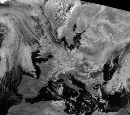 Im Bereich von Hoch 'Isidor' zeigt sich der Süden Englands, große Teile Frankreichs und die Iberische Halbinsel wolkenarm. Deutlich sind noch die verschneiten Hochlagen der Pyrenäen zu kennen. Tief 'Christa' über Nordrussland und das nachfolgende Tief 'Dagmar' mit Zentrum über der Nordsee bringen Mittel- und Osteuropa teils dichte Wolken und Regen, Schneeregen oder Schnee.