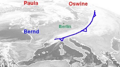 Die Kaltfront von Tief „Oswine“ über Finnland erstreckt sich vom Zentrum des Tiefs über Osteuropa bis zu den Alpen, dahinter ist es verbreitet aufgelockert bewölkt, in feuchter Luft haben sich vor allem über den Baltikländern Schauerwolken entwickelt. Über Südskandinavien und Dänemark halten sich mehrere Wolken, sie gehören dem Sturmtief „Paula“ bei Schottland.