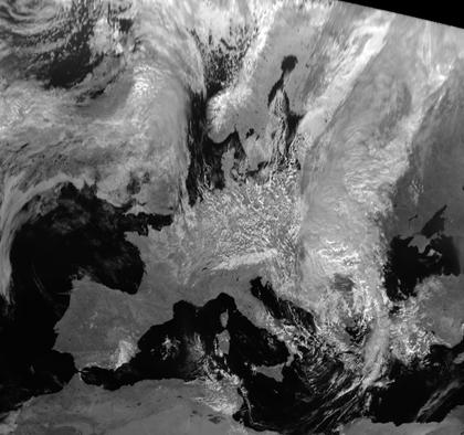 Auf dem Satellitenbild ist über Mitteleuropa die zelluläre Bewölkung in labilisierter eingeflossener Polarluft erkennbar. Die Iberische Halbinsel und der Westen Frankreichs liegen bereits unter Einfluss des Hochdruckgebietes 'Vanessa' und sind größtenteils wolkenfrei.