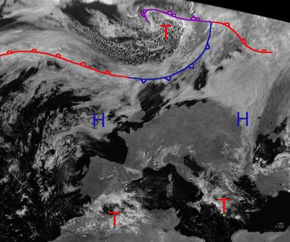 Eine Hochdruckbrücke mit den beiden Hochdruckgebieten 'Tomke' bei den Britischen Inseln und Hoch 'Sabine' über Osteuropa sorgt für große Wolkenlücken in diesem Bereich, zum Teil hat sich aber Hochnebel gebildet, vor allem über den kontinentalen Landmassen in Osteuropa. Tiefdruckeinfluss sorgt dagegen weiterhin für Gewitterwolken am Mittelmeer. Tief 'Quinn' über dem Nordmeer dehnt seinen Einfluss bis morgen etwas nach Süden aus, sodass es auch in Deutschland wieder wolkiger wird.