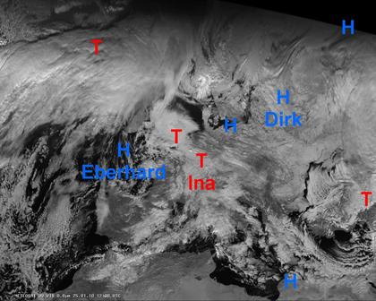 Auf dem Satellitenbild von heute Nachmittag sind vor allem von Großbritannien über Benelux bis in die Südhälfte Deutschlands und weiter bis zu den Alpen dichte Wolken des Tiefs 'Ina' zu erkennen. In diesen Gebieten kommt es verbreitet zu zeitweiligen Schneefällen. Sonst herrscht vor allem in Nord- und Osteuropa auch verbreitet Hochdruckeinfluss und teils freundliches, trockenes, häufig aber auch trübes Wetter. Im Mittelmeerraum bringen einige Tiefdrucksysteme viele Wolken und zahlreiche Schauer oder teils kräftige Gewitter. Im östlichen Mittelmeerraum ist es überwiegend trocken.