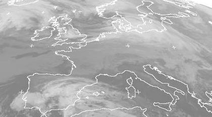 Auf dem Satellitenbild von Sonntag früh sind sowohl dichte Wolken über der Ostsee als auch über der Iberischen Halbinsel zu erkennen. Beide Wolkenfelder gehören zu Tiefdruckgebieten und sorgen gebietsweise für Regen. Zwischen diesen beiden Tiefs bringt eine Hochdruckbrücke von Atlantik bis in den Mittelmeerraum ruhiges, teils freundliches, teils trübes Wetter. (Bildquelle: NERC Satellite Receiving Station, Dundee University, Scotland, http://www.sat.dundee.ac.uk/)