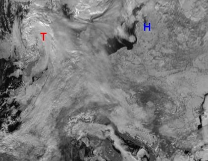 Die Ausläufer eines Tiefs bei Schottland sorgen für dichte Wolken mit Regen oder Schnee von Frankreich bis nach Deutschland. Weiter in Osten bringt ein kräftiges Hoch meist freundliches aber kaltes Winterwetter. Hier sind weite Flächen wolkenfrei.