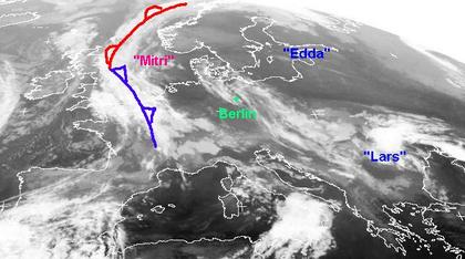 Während es in Osteuropa unter dem Einfluss des Hochs 'Edda' über dem Baltikum wolkenarm bleibt, bringt das Tief 'Mitri' Regen und Gewitter in Westeuropa. Auf dem Sattelitenbild vom Freitagmorgen erstreckt sich die Kaltfront des Tiefs von den Britischen Inseln bis nach Benelux und Frankreich. Ein weiteres Tief mit dem Namen 'Lars' sorgt für unbeständiges Wetter auf dem nördlichen Balkan. Über Spanien baut sich einkleines Tief auf, morgen bringt es zum Teil kräftige Niederschläge auf den Balearen.
