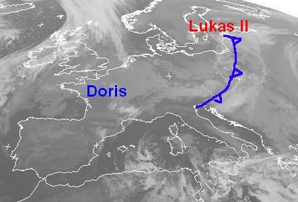 In West- und Südwesteuropa sorgt Hoch „Doris“ mit Zentrum über Frankreich für ruhiges, teils heiteres, teils aber trübes Wetter, vor allem über Nordfrankreich Benelux und Westdeutschland sind hochnebelartige Wolkenfelder zu erkennen. Tief „Lukas“ über dem Baltikum bringt Schnee in Osteuropa, auch in Ostdeutschland kann es ein wenig schneien. Ein weiteres Tief bringt Wolken und Niederschläge im Mittelmeerraum (Bildquelle: NERC Satellite Receiving Station, Dundee University, Scotland, http://www.sat.dundee.ac.uk/)