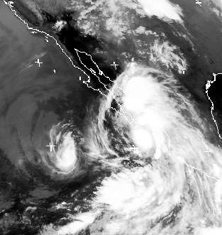 Der Hurrikan 'John' liegt an der Südspitze von Niederkalifornien. Zurzeit erreicht er nahe dem Zentrum mittlere Windgeschwindigkeiten bei 185 km/h und Spitzenböen von bis zu 250 km/h. Er bringt auch kräftigen Regen. Er zieht weiter nordwestwärts und wird sich etwas abschwächen. Westlich von ihm erkennt man den kleineren und wesentlich schwächeren Sturm 'Kristy'.(Bildquelle: NERC Satellite Receiving Station, Dundee University, Scotland, http://www.sat.dundee.ac.uk/)