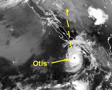 Der tropische Sturm 'Otis' nahe der mexikanischen Pazifikküste hat sich zu einem Hurrikan mit Windgeschwindigkeiten von etwa 150 km/h entwickelt, auf dem Satellitenbild ist das Auge des Tiefs gut zu erkennen. In den nächsten Tagen verstärkt er sich weiter und zieht in Richtung Niederkalifornien.
