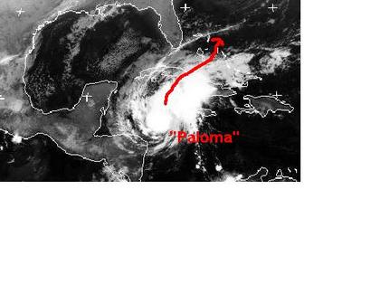 Der tropische Sturm 'Paloma' im Karibischen Meer hat sich zum Hurrikan verstärkt. Zurzeit erreicht er mittlere Windgeschwindigkeiten von 130, in Böen 155 km/h. Berechnungen zufolge soll er sich noch weiter verstärken und voraussichtlich am Sonntag über Kuba hinwegziehen. Sein Endziel ist allerdings noch unklar. (Bildquelle: NERC Satellite Receiving Station, Dundee University, Scotland, http://www.sat.dundee.ac.uk/)