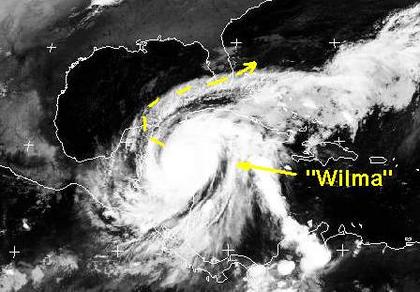 Der Hurrikan 'Wilma' über dem Karibischen Meer erreicht zur Zeit Windgeschwindigkeiten von 250 km/h, Berechnungen zufolge verstärkt er sich noch etwas und zieht in den nächsten Tagen zwischen der mexikanischen Halbinsel Yukatan und Kuba nach Norden, danach ändert er seine Richtung auf Nordosten und nimmt Kurs auf Florida.
