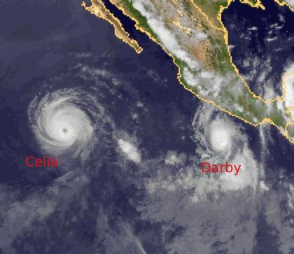 Über dem Pazifik, in deutlichem Abstand südwestlich der mexikanischen Küste, liegt der Hurrikan 'Celia'. Sein Auge ist deutlich zu erkennen. Er erreicht in Böen derzeit Windgeschwindigkeiten bis zu 210 km/h. An den kommmenden Tagen schwächt er sich jedoch ab. Weiter östlich, näher an der Küste, liegt der nur wenig schwächere Hurrikan 'Darby' mit Spitzböen von bis zu 190 km/h. Auch er wird sich an den kommenden Tagen eher allmählich abschwächen. Er bewegt sich jedoch kaum vom Fleck, möglicherweise kann er sich auch noch näher zur Küste hin verlagern. Damit ist eine Gefahr für die Küstenregion nicht ausgeschlossen.