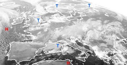 Auf dem Satelittenfoto von heute Morgen 6 Uhr MEZ zeigt sich die Iberische Halbinsel weitgehend wolkenlos, während es im übrigen Europa mit Ausnahme von Italien verbreitet locker bis stark bewölkt ist. Von den Britischen Inseln über die Beneluxstaaten, Norddeutschland, die Ostsee bis nach Nordwestrussland ziehen vermehrt Tiefdruckausläufer und sorgen somit für teils häufige Niederschläge. Die Temperaturen reichen von 3 Grad am Nordkap, 13 Grad in Stockholm und Berlin, 15 Grad in Bordeaux, 19 Grad in Madrid, 23 Grad in Rom bis 28 Grad in Athen.