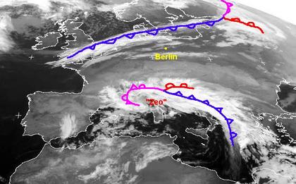 Die Kaltfront von Skandinavientief 'Albert' erstreckt sich auf dem Satellitenbild von Montag früh vom Baltikum bis nach Südengland. Im Laufe des Tages wird sie weiter nach Süden ziehen und für leichten Regen, örtlich auch gefrierenden Regen sorgen. Das Tief 'Zeo' liegt über Italien und sorgt weiterhin hier und auf dem südlichen Balkan für teils kräftige Regenfälle. Vom Atlantik über die Alpenländer bis zum Schwarzen erstreckt sich eine Hochdruckbrücke und sorgt für teils heiteres, teils auch trübes Wetter.