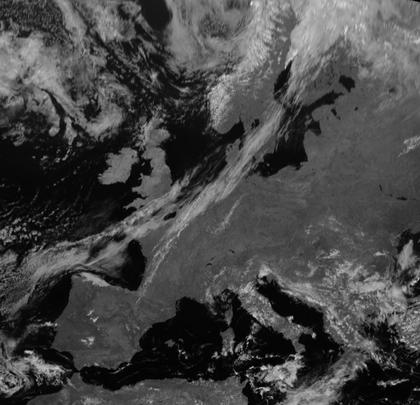 Die Kaltfront von Nordmeertief 'Jochen' erstreckt sich entlang des Wolkenbands von Südschweden über Norddeutschland und die Niederlande bis zur Bretagne. Über den meisten Teilen Mitteleuropas finden sich jedoch unter Hochdruckeinfluss kaum Wolken. Aber auch nördlich der Front liegen nur sehr wenige Wolken in der kühleren Luft.