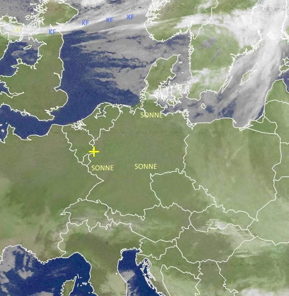 Zwischen Schottland und der norwegischen Küste ist schon die Kaltfront zu sehen, die uns ab Samstag beschäftigen wird. Sie bringt neue Kaltluft nach Deutschland. Vorher wird es ab Donnerstag etwas milder. Mit wenig Regen wird es nass, bevor am Samstag wieder winterliche Luft folgt.
