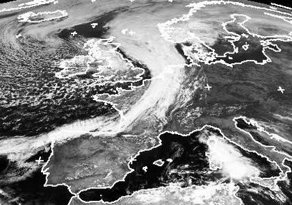 Auf dem Satellitenbild vom Montagmittag findet man über großen Teilen Mitteleuropas noch keine Bewölkung. Dagegen erstreckt sich ein dichtes Wolkenband von der Nordsee über die Niederlande und Frankreich bis an die Küste Spaniens. Die Bewölkung gehört zur Kaltfront von Tief 'Enrico' bei Schottland. Sie zieht von Westen nach Deutschland herein und sorgt so für ein abruptes Ende des spätsommerlichen Wetters. Auf ihrer Rückseite folgt von Westen deutlich kühlere Luft. Auf dem Atlantik hat sich bereits aufgelockerte Schauerbewölkung gebildet. (Bildquelle: NERC Satellite Receiving Station, Dundee University, Scotland, http://www.sat.dundee.ac.uk/)