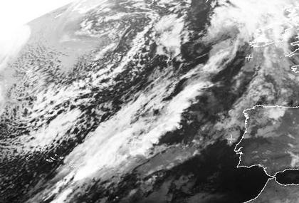 Der Ausschnitt zeigt den Kaltlufvorstoß über dem Atlantik, wo polare Luft auf breiter Front nach Süden geführt wird. Die scheinbar geschlossene Wolkendecke im linken oberen Bildbereich ist nicht wirklich geschlossen; jedoch reicht die Bild-Auflösung der Satelliten-Kamera in diesem Bereich nicht mehr aus um die zellenförmige Wolkenstruktur noch zu erfassen.