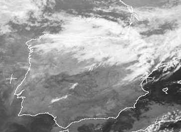 Auf dem Satellitenbild sind zwar dichte Wolken über Nordspanien zu erkennen, doch fällt kaum Regen aus ihnen. Wahrscheinlich verdunstet der Niederschlag auch in der Luft, sodass kein Regen den Boden erreicht.