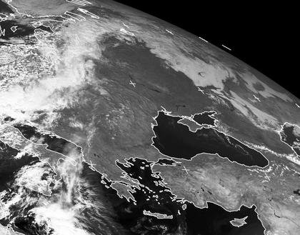 Über Südosteuropa und am Schwarzen Meer ist es am Donnerstag Mittag meist wolkenlos. Im Nordwesten rückt aber die Kaltfront von Tief 'Munir' über dem Baltikum mit dichten Wolken nach Südwesten vor. Sie wird in den nächsten Tagen bis in den Westen der Türkei und ans Schwarze Meer teils heftige Unwetter bringen. (Bildquelle: NERC Satellite Receiving Station, Dundee University, Scotland, http://www.sat.dundee.ac.uk/)
