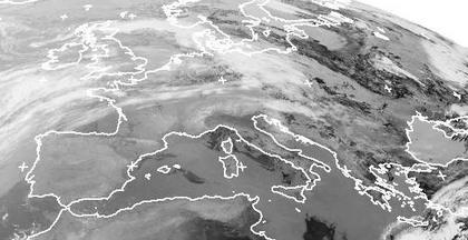 Während über Mitteleuropa Tiefdruckgebiete aus Westen immer wieder dichte Wolken heranbringen sorgt ein Hochdruckgebiet über dem Mittelmeer für einen fast wolkenfreien Himmel. Die Grenze dieser beiden Druckgebilde ist anhand der Wolkenlinie, die sich von der Biskaya über Frankreich bis in den Süden Deutschlands erstreckt, gut zu erkennen. (Bildquelle: NERC Satellite Receiving Station, Dundee University, Scotland, http://www.sat.dundee.ac.uk/)