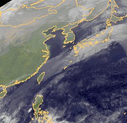Entlang einer Luftmassengrenze, die warme Luft über dem Pazifik von kälterer im Nordosten trennt, erstreckt sich von Taiwan nach Japan ein Wolkenband, das auch Regen bringt. Über Korea und weiten Teilen Chinas ist es dagegen unter Hochdruckeinfluss meist wolkenfrei.