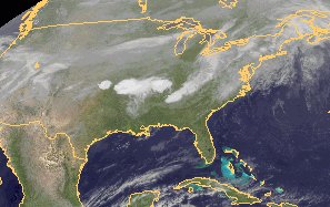Über Nordamerika bewegt sich langsam eine Kaltfront nach Süden, deren Wolkenband jedoch auf dem Satellitenbild nur schwach zu erkennen ist. Deutlich zeichnen sich dagegen einzelne kräftige Gewitterzellen auf ihrer Vorderseite ab, über dem Zentrum der USA.
