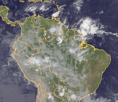 Über Brasilien haben sich kräftige Schauer und Gewitter entwickelt. Diese sind im Satellitenbild gut an der konvektiven Bewölkung erkennbar.