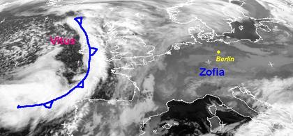 Das Hoch „Zofia“ sorgt für kurze Wetterberuhigung vor allem in Mitteleuropa, es ist teils heiter, gebietsweise sind hochnebelartige Wolkenfelder zu erkennen. Über dem östlichen Atlantik liegt das Sturmtief „Vitus“, seine Kaltfront erstreckt sich vom Zentrum des Tiefs über Irland bis zur Nordwestküste Spaniens, am Donnerstag überquert sie Westeuropa mit teils kräftigen Niederschlägen und teils stürmischem Wind und erreicht am Abend Westdeutschland; auf der Rückseite des Tiefs haben sich mehrere Schauerwolken entwickelt.