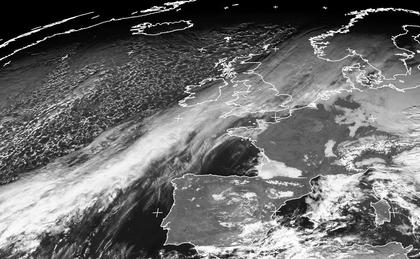 Von Skandinavien über Großbritannien bis weit auf den Atlanitk hinaus erstreckt sich am Montag Mittag ein langes Wolkenband, das zur Kaltfront von Nordmeertief 'Jorrit' gehört. Es kommt jedoch kaum voran, da über dem europäischen Festland wieder Hoch 'Bernhilde' die Regie übernommen hat und damit seine blockierende Wirkung entfalten kann. Dabei ist es hier oft nur gering bewölkt, gebietsweise zeigt das Satellitenfoto aber auch Nebel und Hochnebel (Bildquelle: NERC Satellite Receiving Station, Dundee University, Scotland, http://www.sat.dundee.ac.uk/)