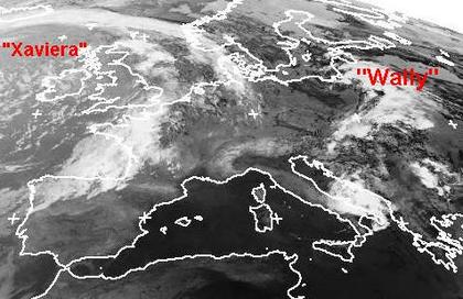 Auf dem Satellitenbild von Sonntag früh sind sowohl die Wolken von Gewittertief 'Wally' über Polen und Weißrussland sowie die Fronten des Atlantiktiefs 'Xaviera' mit Zentrum zwischen Island und Irland gut zu erkennen. Zwischen diesen Tiefs bringt leichter Zwischenhocheinfluss heute in weiten Teilen von Mitteleuropa meist ruhiges und freundliches Wetter, das aber nicht lange anhalten wird, da sich die Kaltfront von Tief 'Xaviera' rasch von Westen her nähert, und neue Schauer und Gewitter mit sich bringt.