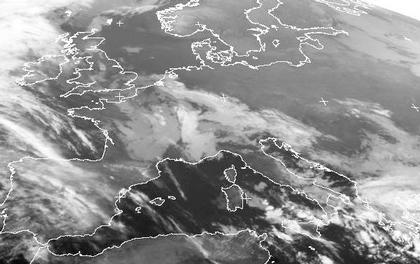Auf dem Satellitenbild von Donnerstag morgen erkennt man ein Wolkenband, dass sich von den Benelux-Ländern über Süddeutschland und den Alpen bis an die Adria erstreckt. Dieses Wolkenband liegt auf der Grenze zwischen zwei Luftmassen. Im Nordosten sorgt Hoch 'Leia' über Skandinavien für trockene und kalte Luft, während im Westen noch feuchtwarme Luft von Tief 'Menno' mit Zentrum über dem Ärmelkanal vorherrscht.