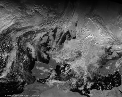 Das heutige Satellitenfoto zeigt verbreitet dichte Wolken vom zentralen Mittelmeer, über Mittel- bis nach Osteuropa, in diesen Gebieten fällt zeitweise Regen, nach Norden und Osten hin meist Schnee.