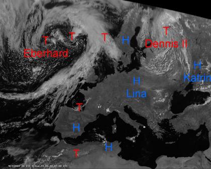 Auf dem heutigen Satellitenbild zeigt sich Europa unter Hochdruckeinfluss meist wolkenlos oder heiter. Tiefdruckeinfluss sorgt vor allem bei den Britischen Inseln, in Südnorwegen und über dem nordwestlichen Russland für teils kräftige Schauer oder Gewitter und teils für ergiebigen Regen.