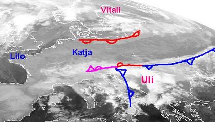 Eine Hochdruckbrücke erstreckt sich von der Iberischen Halbinsel und Frankreich über Mitteleuropa bis nach Westrussland, hier herrscht trocken-warmes Spätsommerwetter. Am Südrande dieses Hochdruckgebietes hat sich eine Frontalzone gebildet, sie reicht von Italien über die Balkanhalbinsel bis zum Ural, zu Teil kräftige Niederschläge sind dabei vor allem auf dem Balkan zu erwarten. Entlang der Ostseeküste sind Wolken der Warmfront von Skandinavientief 'Vitali' zu erkennen, sie sorgen für teils trübes Wetter im Nordosten Deutschlands.
