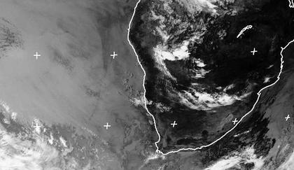 Auf dem Satellitenbild von Samstag früh sind über dem südafrikanischen Kontinent nur wenige Schauer zu erkennen. Auf dem Südatlantik breitet sich dagegen eine weitreichende Nebelschicht aus. Sie entsteht dadurch, dass warme Festlandsluft über kaltes Atlantikwasser streicht, sich dabei abkühlt, und das in ihr enthaltene Wasser kondensiert. Es entsteht Nebel. (Bildquelle: NERC Satellite Receiving Station, Dundee University, Scotland, http://www.sat.dundee.ac.uk/)