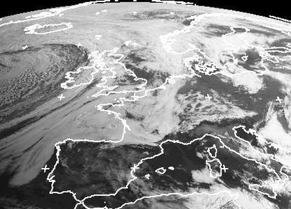 Das Tief 'Icarus' südlich von Island lenkt mit seinen Fronten von Westen Wolken auch nach Deutschland. Heute bestimmt aber meist noch Zwischenhocheinfluss das Wetter. Auf dem Satellitenbild vom Morgen sind daher kaum Wolken, nur über Süddeutschland verbreitete Nebelfelder zu erkennen. Die hochnebelartige Bewölkung in der feuchtere Luft im Westen zieht jedoch schon langsam herein. (Bildquelle: NERC Satellite Receiving Station, Dundee University, Scotland, http://www.sat.dundee.ac.uk/)